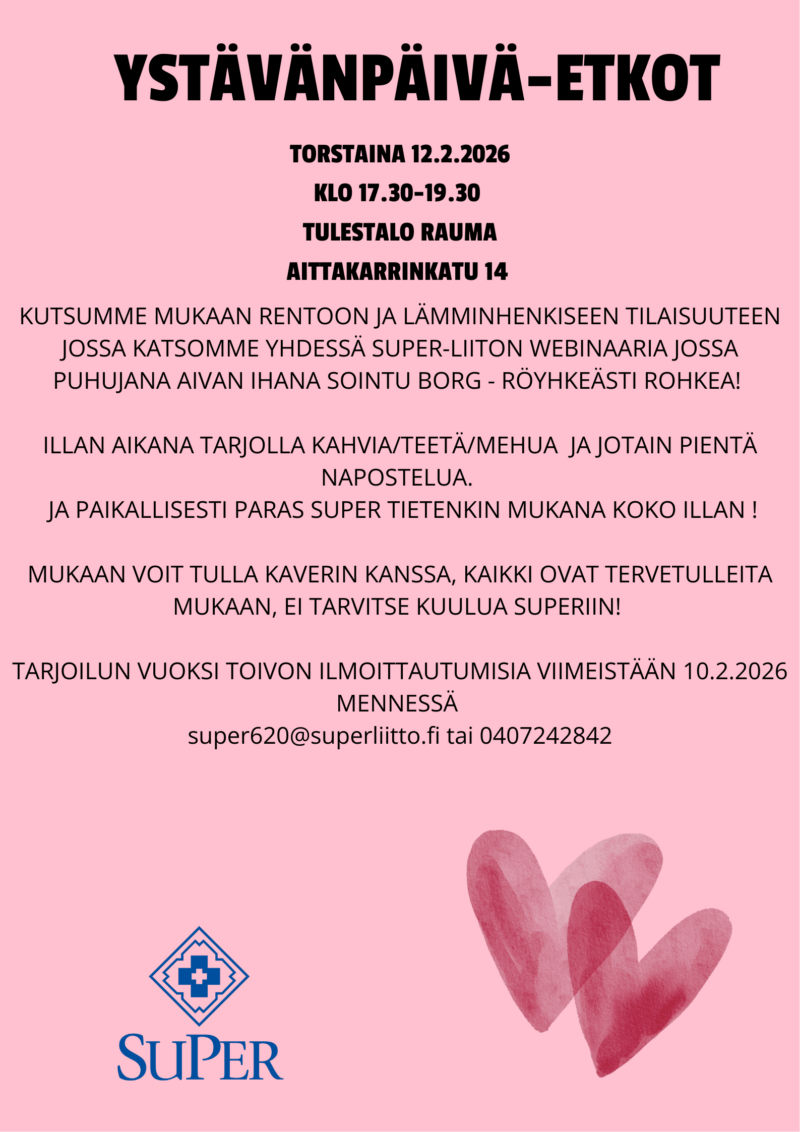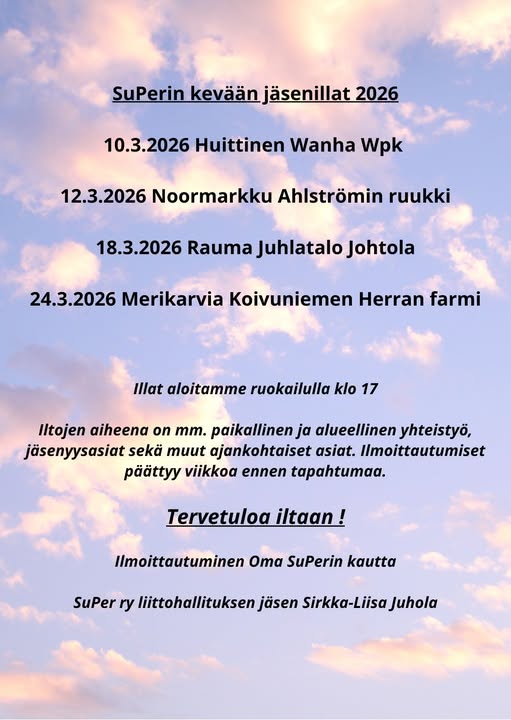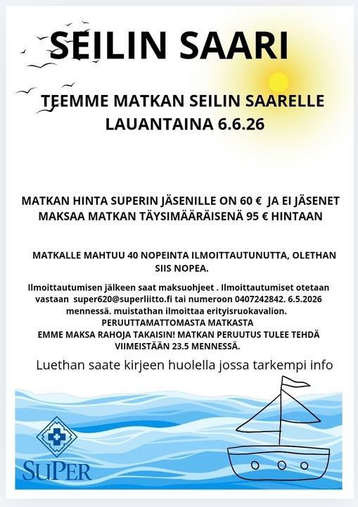 ilmoittautumiset 6.5.26 mennessä super620@superliitto.fi tai numeroon 0407242842 , myös erikoisruokavaliot tulee ilmoittaa. PERUUTTAMATTOMASTA MATKASTA EMME MAKSA RAHOJA TAKAISIN!!! JA MATKA TULEE PERUTTAA AJOISSA VIIMEISTÄÄN 23.5.26 MENNESSÄ. Ilmoittautuneille lähetän maksutiedot sähköpostilla myöhemmin.