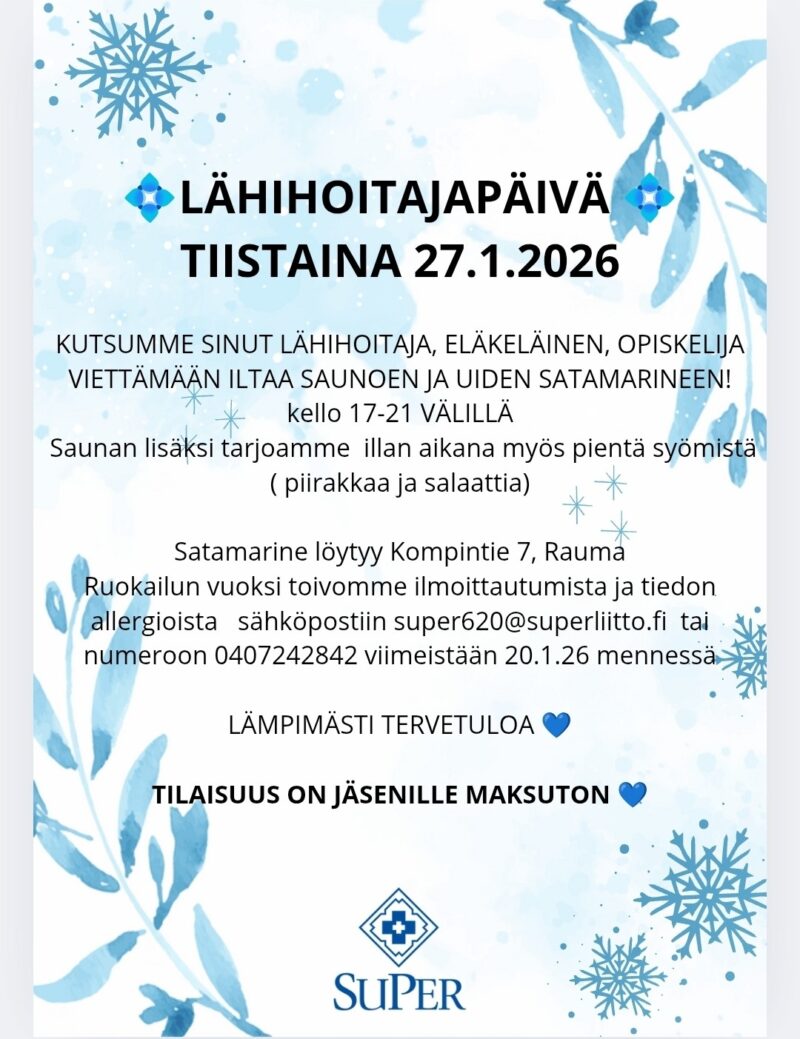Tule mukaan viettämään iltaa yhdessä muiden lähihoitajien kanssa saunoen ja uiden sekä pienen iltapalan kera. Saat tulla klo 17-21 välillä miten itse haluat ja ehdit. Iltapalan vuoksi toivoisin ilmoittautumista. Pidetään yhdessä rento ja mukava ilta 🙂